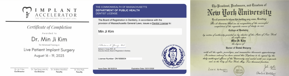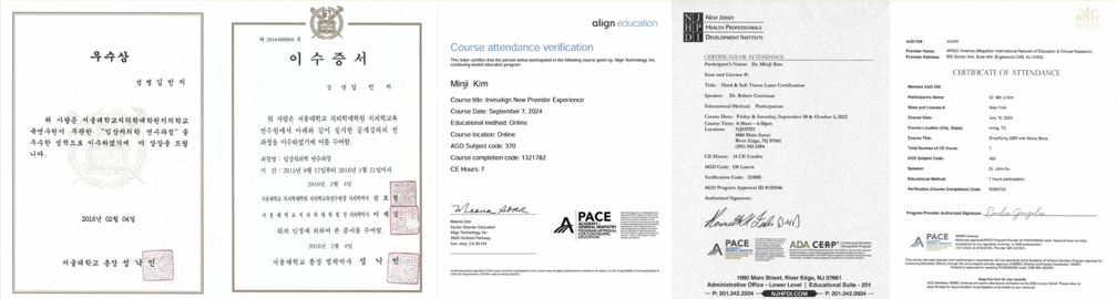 - Completed advanced courses at Seoul National University, Harvard School of Dental Medicine, and international implant live surgeries